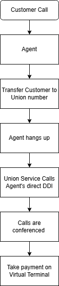 When it's time to take a payment the Agent forwards the customer call to the Union number, then the agent hangs up. After a brief delay the Union service calls the agent to the Agents DDI, conferencing all calls together.