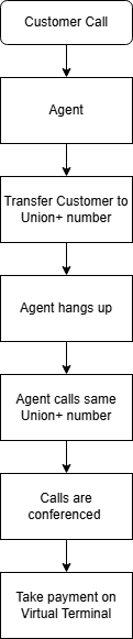 When it's time to take a payment the Agent forwards the customer call to the Union Plus number, then the agent hangs up and calls into the same number.